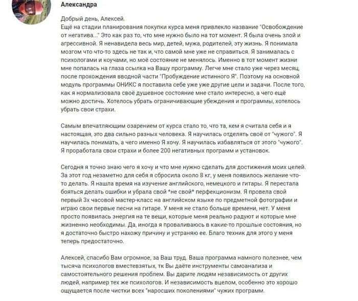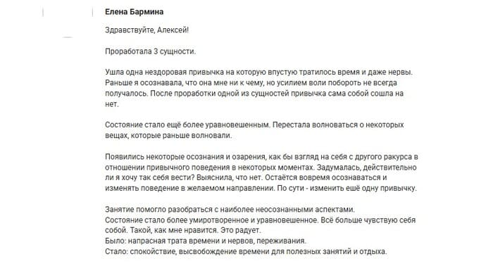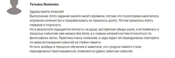 Эта программа исключительно практическая и каждое её упражнение работает с реальными процессами, которые происходят в жизни каждого человека. Результативность наших практик подтверждена уже многолетним опытом работы, а также множеством отзывов, небольшая часть из которых представлена на данной странице.